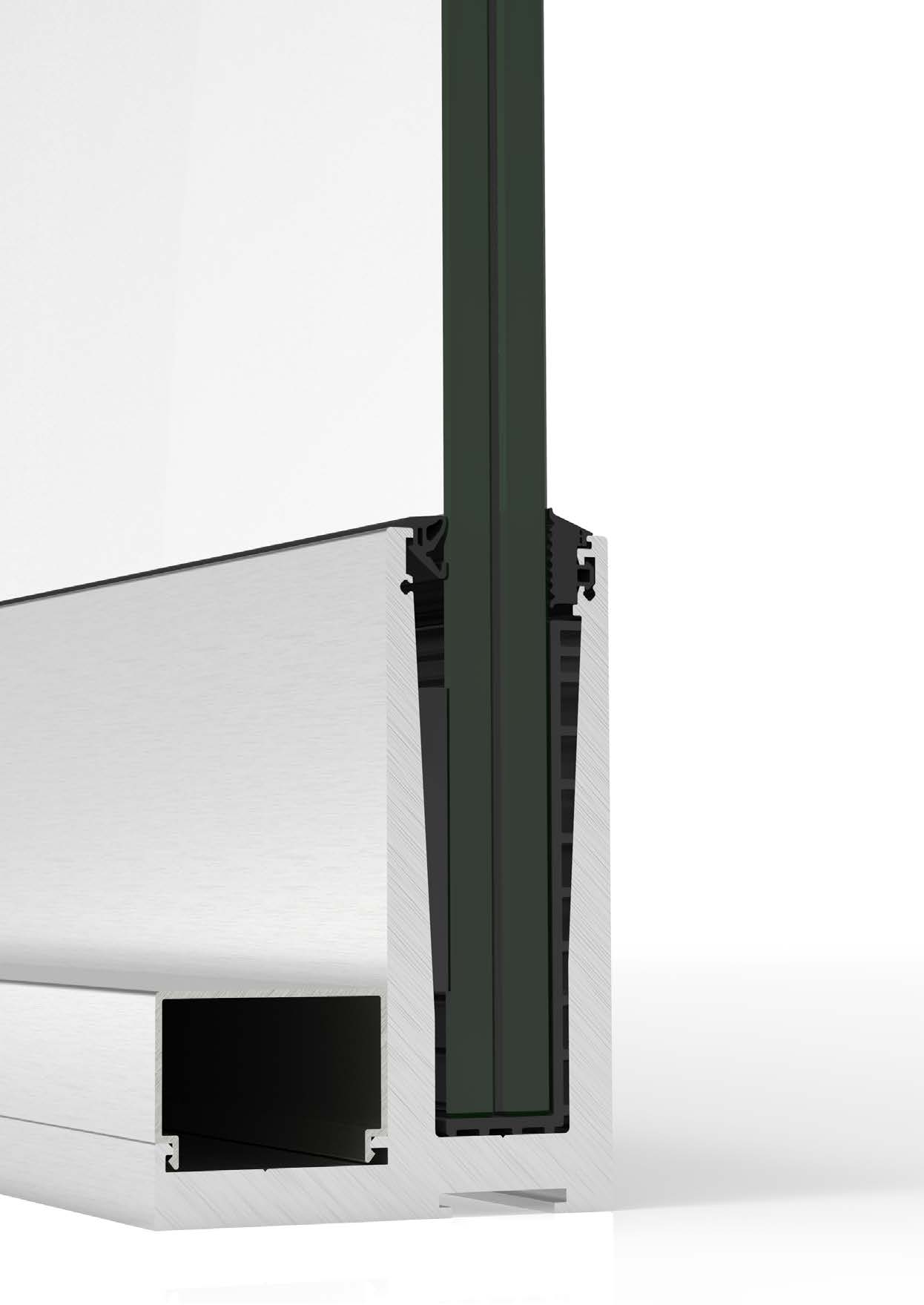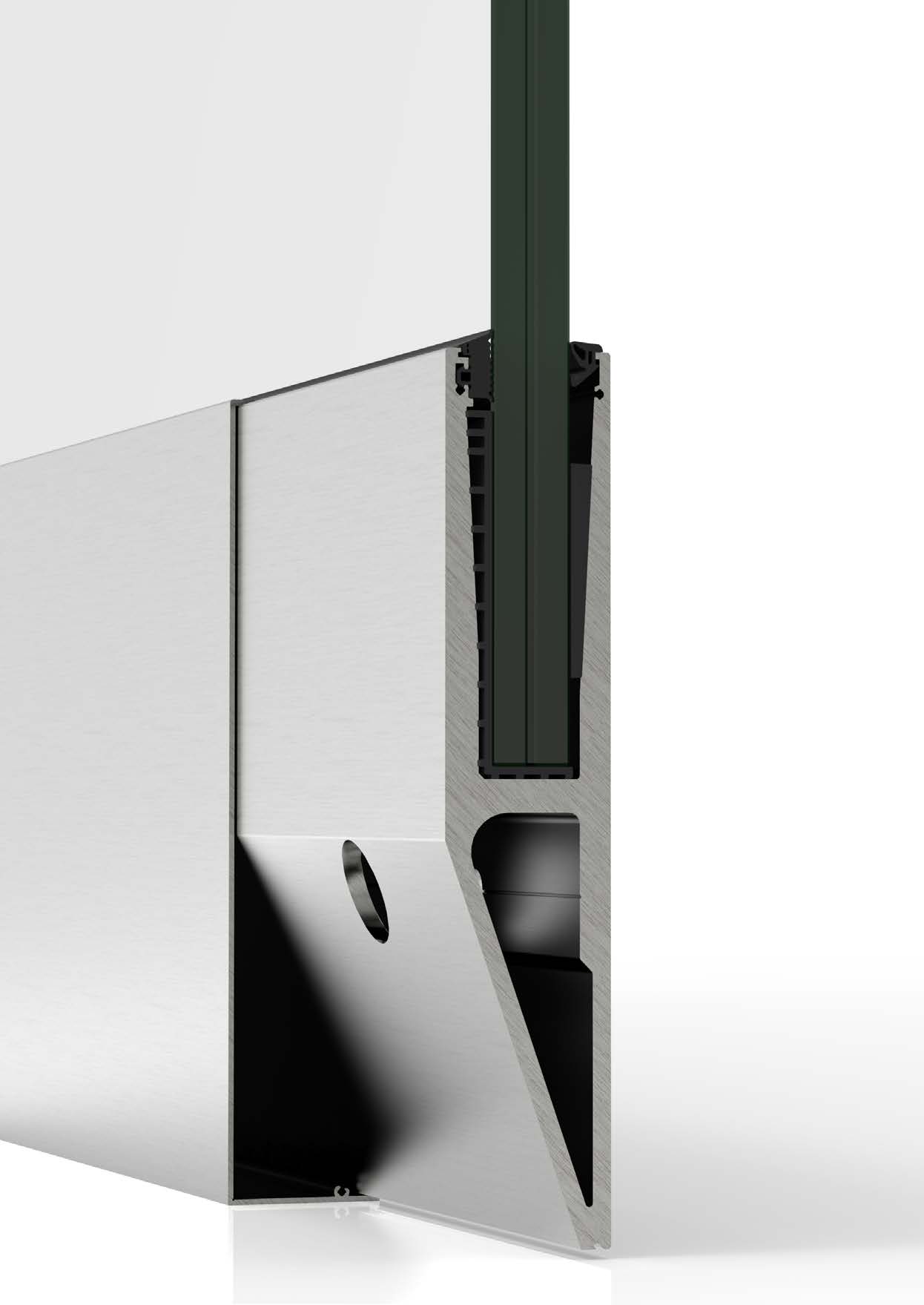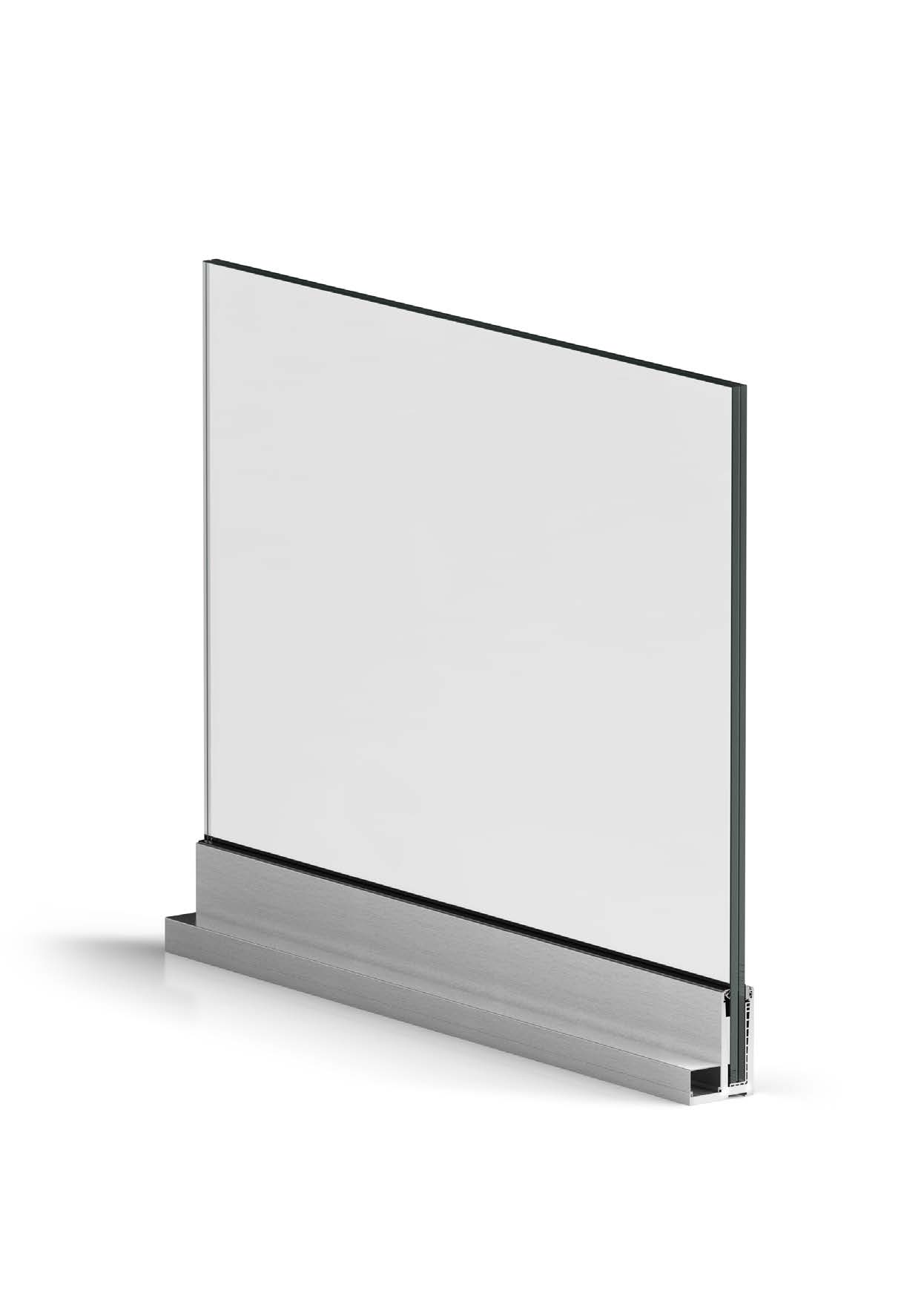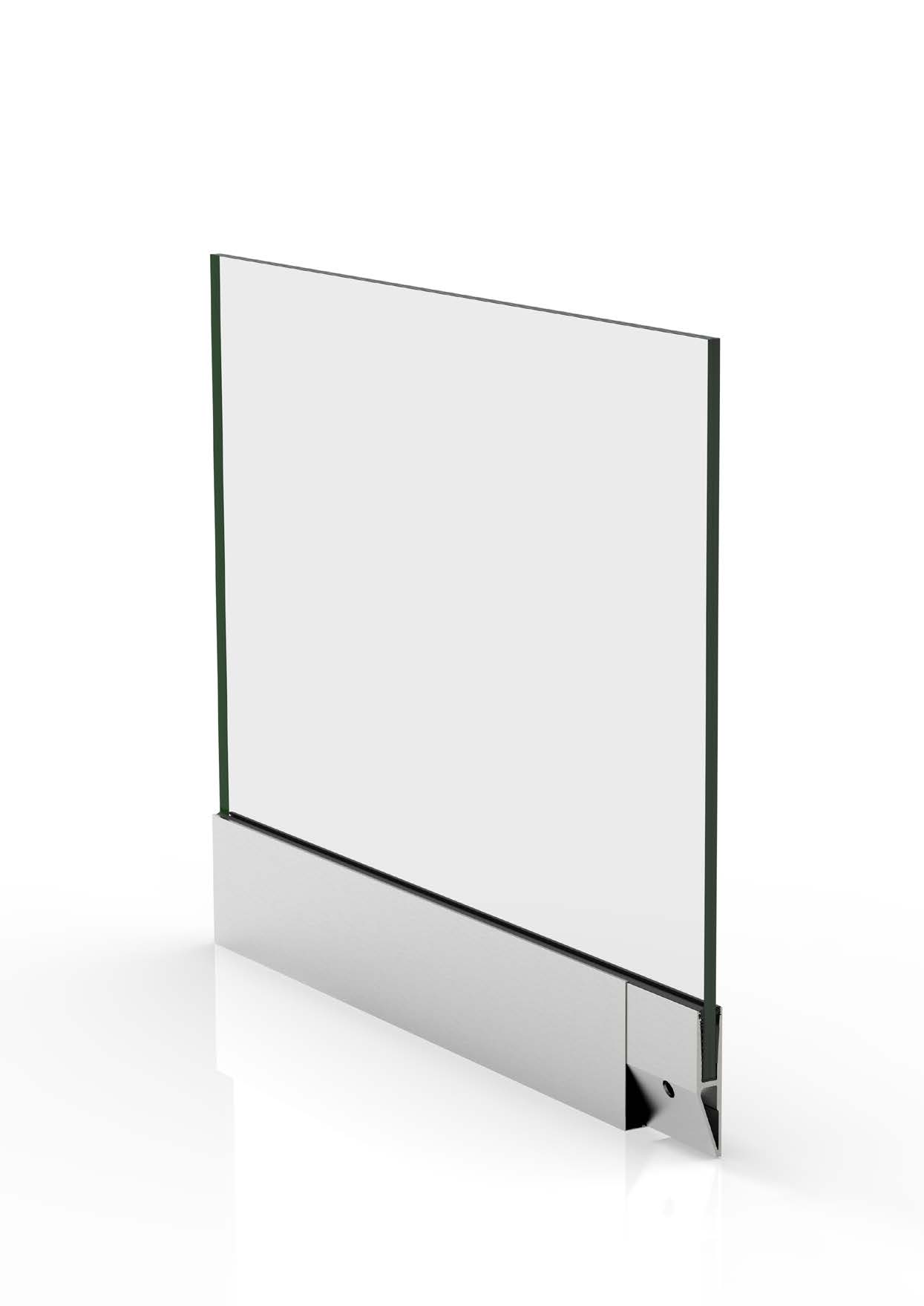 Składa się z profilu „U”, zaprojektowanego pod kątem osadzenia bezpiecznej szyby laminowanej ze szkła hartowanego, który może być mocowany zarówno od góry jak i do czoła konstrukcji.